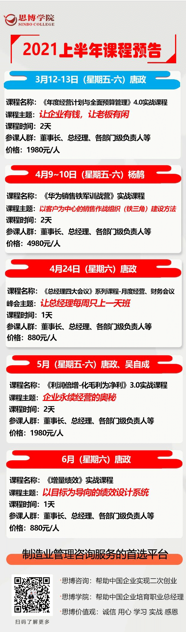 深圳市思博企業(yè)管理咨詢有限公司(sinbo) 是擁有多年管理實(shí)踐的實(shí)戰(zhàn)型管理咨詢企業(yè),思博數(shù)十人的咨詢師團(tuán)隊(duì)用近十年的時(shí)間潛心研究世界管理大師彼特·德魯克的目標(biāo)管理及臺(tái)灣陳宗賢教授的企業(yè)經(jīng)營計(jì)劃管理,同時(shí)深入日本、臺(tái)灣、歐美等知名企業(yè)學(xué)習(xí)先進(jìn)管理理念及技能,結(jié)合中國企業(yè)本土化的特點(diǎn),成功研究出一套適合中國國情的企業(yè)經(jīng)營管理系統(tǒng)《企業(yè)年度經(jīng)營計(jì)劃與全面預(yù)算管理》。該系統(tǒng)在思博團(tuán)隊(duì)的潛心指導(dǎo)下,已成功幫助中國數(shù)百家企業(yè)實(shí)現(xiàn)年業(yè)績?cè)鲩L40%